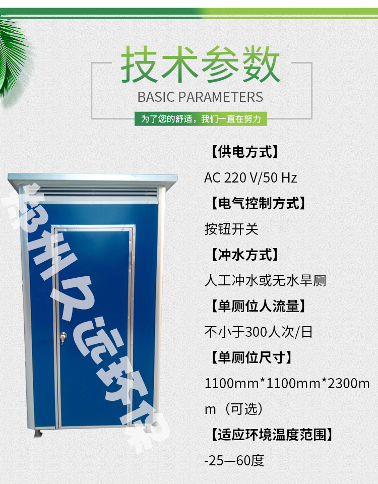 移動廁所不受任何工作環(huán)境的限制,外形結(jié)構(gòu)輕巧,顏色搭配合理。 適用于城市街道、旅游景點、建筑工地、公園綠化、生活小區(qū)、車站、碼頭、廣場等人口密集的公共場所及繁華商業(yè)街等場所。 移動洗手間具有可移動性、方便運輸、安裝簡單等優(yōu)點。 移動廁所水沖式內(nèi)部配置: 蹲便器、沖水箱、洗手池、排風(fēng)扇、照明開關(guān)、門鎖 ...